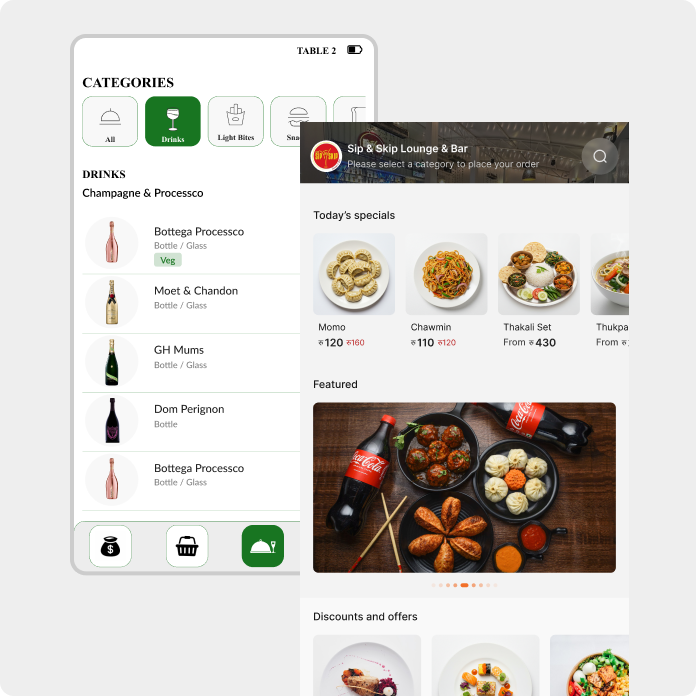 Our main objective was to define the MVP without compromising the user experience and design around it. For the first release phase, we started with a simple menu-based flow, then iterated on it by introducing a featured and discount section to encourage upselling.